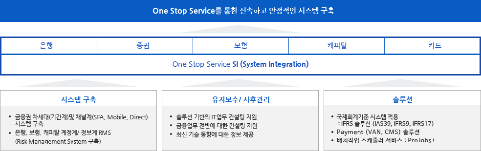 아시아나IDT는 금융환경의 변화에 대응하는 고객의 니즈를 사전에 파악하여 선제안 및 컨설팅을 통해 보다 효율적이고 선진적인 IT 서비스를 제공하고 있으며, 금융사의 기간계/정보계 시스템 구축 및 SFA시스템, 모바일시스템, 다이렉트시스템, 리스크관리시스템 개발 등 금융분야 IT 토탈 서비스를 제공하고 있습니다.