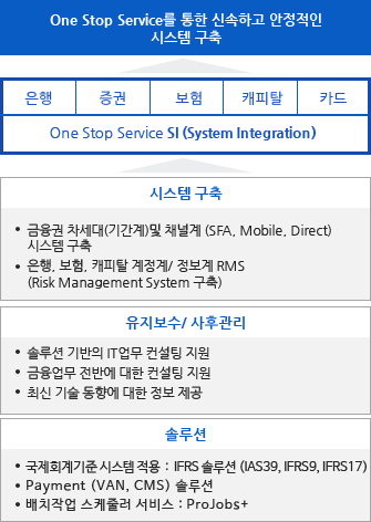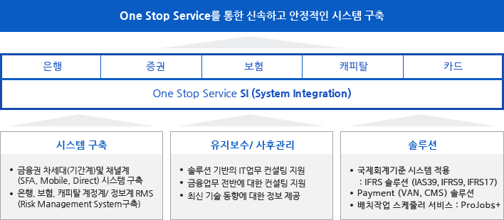 아시아나IDT는 금융환경의 변화에 대응하는 고객의 니즈를 사전에 파악하여 선제안 및 컨설팅을 통해 보다 효율적이고 선진적인 IT 서비스를 제공하고 있으며, 금융사의 기간계/정보계 시스템 구축 및 SFA시스템, 모바일시스템, 다이렉트시스템, 리스크관리시스템 개발 등 금융분야 IT 토탈 서비스를 제공하고 있습니다.